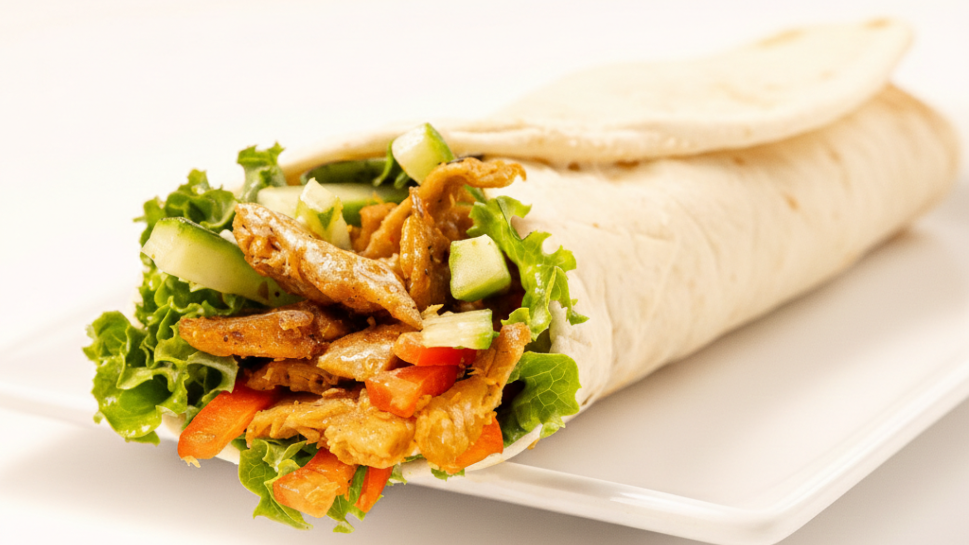Plant-based chicken shawarma with Middle Eastern spices, fresh veggies, garlic sauce, and hummus.